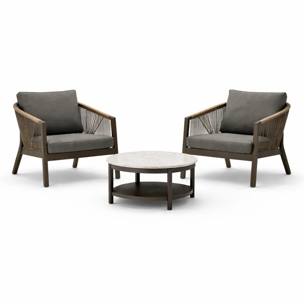 Il set comprende due poltrone e un tavolino rotondo.