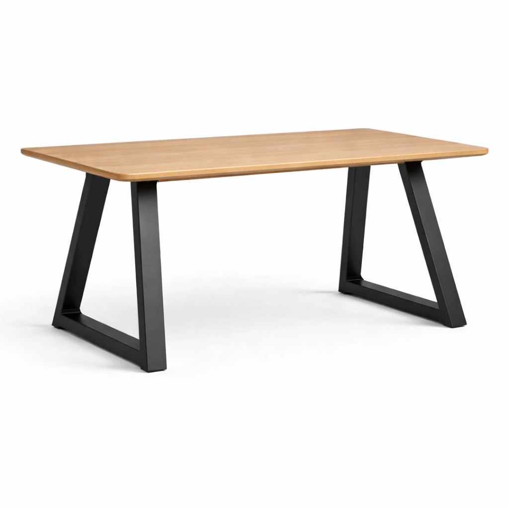 Il tavolo ha una forma rettangolare con gambe a trapezio rovesciato. La superficie è di colore legno naturale, mentre la struttura è nera.